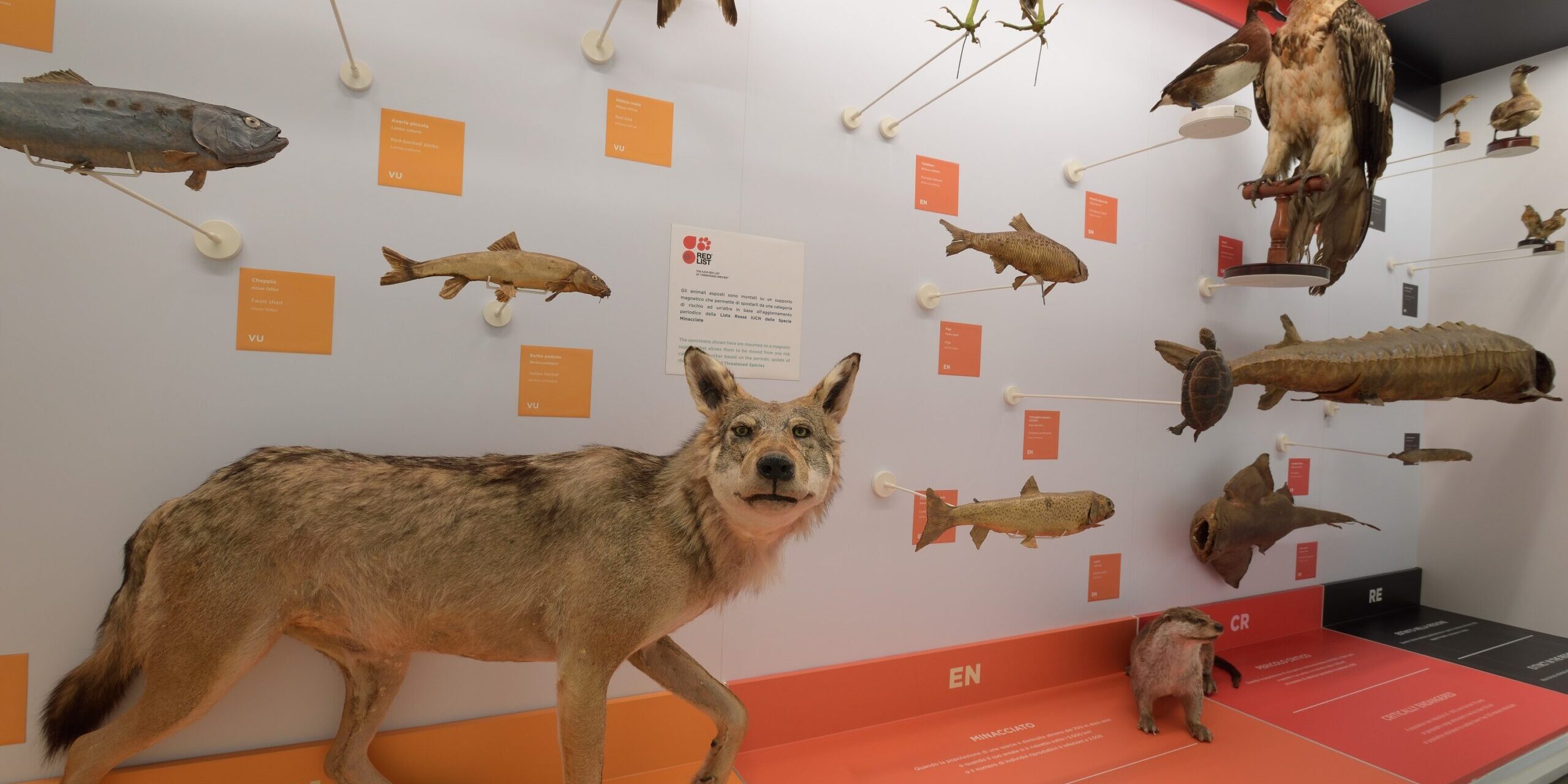 In occasione della realizzazione del percorso espositivo di Kosmos è stata creata, all’interno della sala dedicata all’antropocene, una parete espositiva pensata espressamente per illustrare la lista rossa IUCN (International Union for Conservation of Nature) uno strumento che i ricercatori di tutto il mondo usano per stabilire le priorità di conservazione delle specie in pericolo di estinzione. La grande vetrina mostra le categorie di rischio per alcune delle specie di vertebrati italiani. L’allestimento permette lo spostamento degli esemplari sulla parete di fondo in relazione agli aggiornamenti della lista IUCN. Negli ultimi anni alcune delle specie esposte sono diventate più rare e minacciate mentre per altre gli interventi di tutela hanno permesso un miglioramento del loro status in Italia. Durante l’evento i curatori del museo modificheranno in diretta l’allestimento della vetrina con nuovi inserimenti e spostamenti di categoria. Sarà l’occasione per conoscere più da vicino alcuni di questi animali.