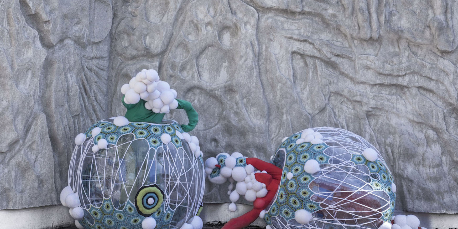 L’azione interattiva tra due corpi umanoidi, senza identità di genere, rende visibile l’invisibile. La mitosi cellulare si traduce in una performance ed installazione tessile immersiva dove è il potenziale immaginativo ad essere generato e svelato. Moti perpetui e relazioni simbiotiche trasformano lo spazio urbano con un intervento site-specific che immagina e rappresenta un nuovo ecosistema rigenerativo.
