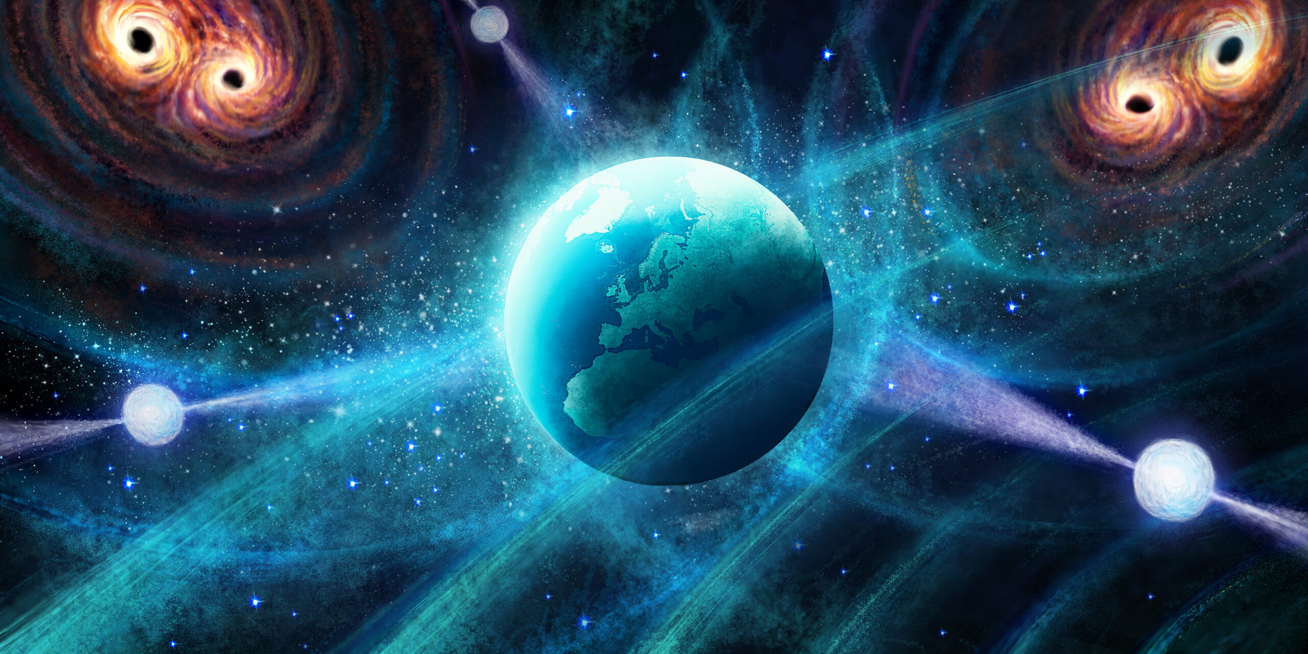 Descrizione immagine: rappresentazione grafica dell’utilizzo di un Pulsar Timing Array per la rivelazione di onde gravitazionali generate da coppie di buchi neri supermassici al centro di galassie in fase di fusione. Immagine di Danielle Futselaar (Max Planck Institute for Radio Astronomy).