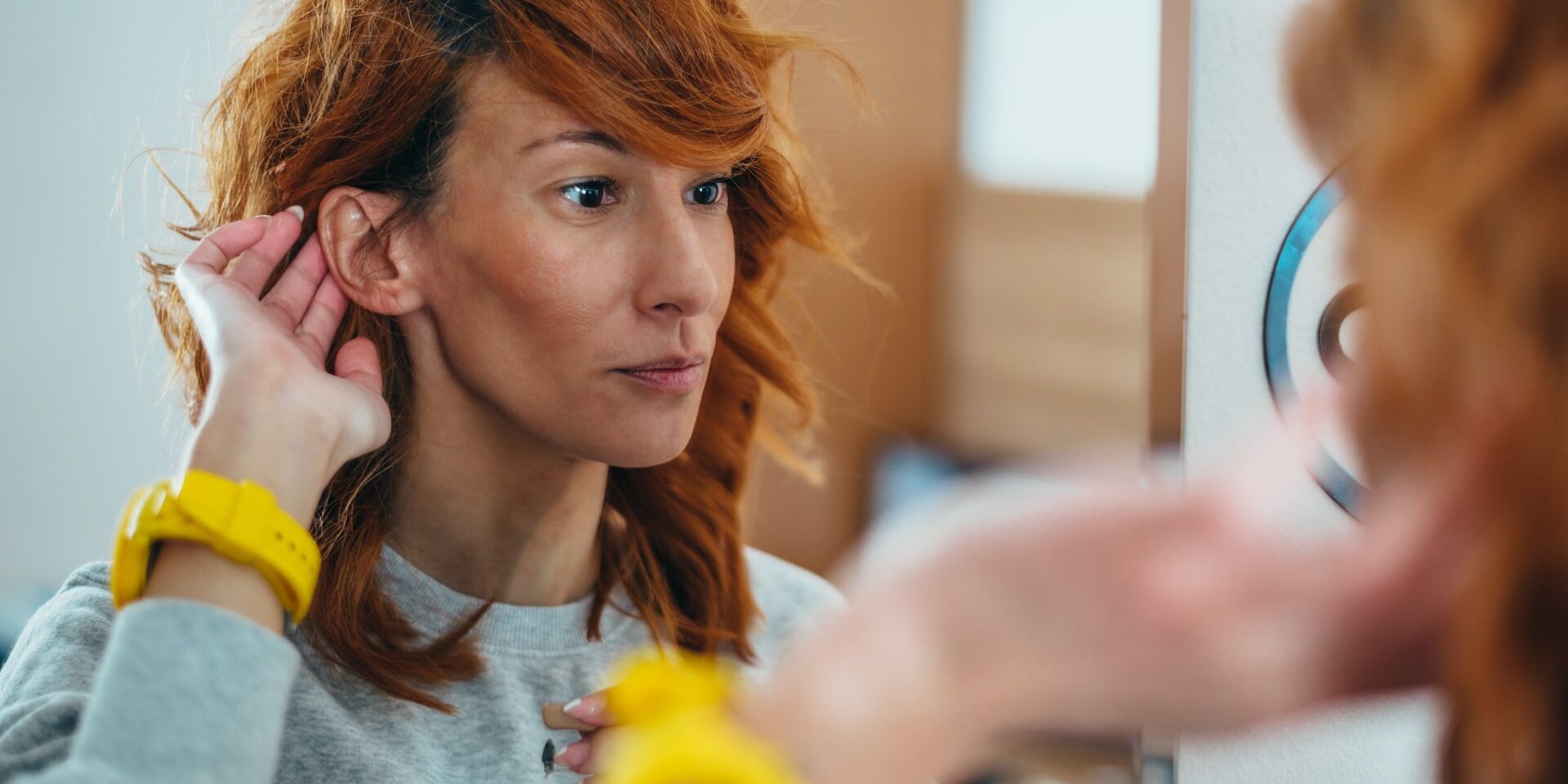 Descrizione foto: una giovane donna sistema il suo apparecchio acustico